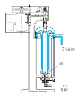 主軸帶動轉(zhuǎn)鼓繞自身軸線高速旋轉(zhuǎn),在轉(zhuǎn)鼓內(nèi)形成強大的離心力場。物料由底部進料口進入轉(zhuǎn)鼓內(nèi),在離心力作用下,迫使物料沿轉(zhuǎn)鼓內(nèi)壁向上流動。質(zhì)量輕的液體經(jīng)轉(zhuǎn)鼓上部排液口排出,通過集液盤回收;質(zhì)量重的固體沉積在轉(zhuǎn)鼓內(nèi)壁上,形成沉渣層,停機后人工清除。