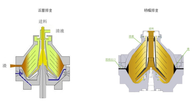 電機(jī)通過螺旋齒輪副驅(qū)動(dòng)轉(zhuǎn)鼓繞主軸軸線做高速旋轉(zhuǎn),在轉(zhuǎn)鼓內(nèi)形成強(qiáng)大的離心力場。物料由上部中心進(jìn)料管流入轉(zhuǎn)鼓底部,通過碟片分流孔趨向轉(zhuǎn)鼓壁空間。在離心力作用下,液相沿碟片內(nèi)錐面趨向轉(zhuǎn)鼓壁流動(dòng)至上部的出液口排出。比液相重的固相物沉積向轉(zhuǎn)鼓內(nèi)壁形成沉渣,由排渣裝置自動(dòng)排出機(jī)外或停機(jī)后由人工清除。
